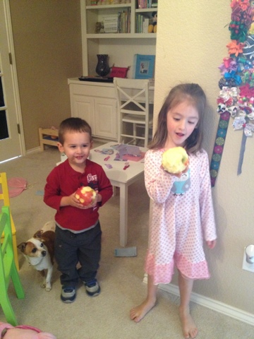 We just found both kids in Blake's shower (where they like to sit and play) eating apples. But the funny part is, Tim bought those apples especially for his overnight trip for work tomorrow. They took the huge apples and were happily eating them, secretly! Oh well, luckily daddy didn't care and just laughed about it!